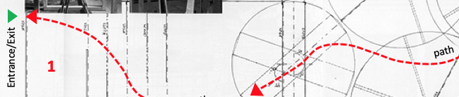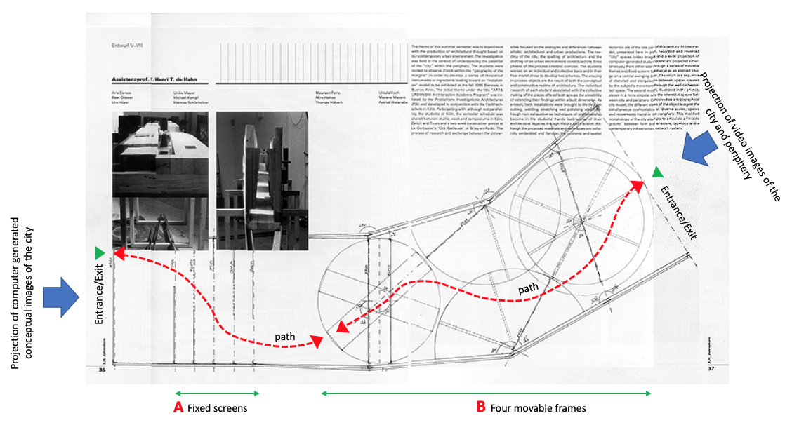 The full-scale installation that is the subject of this exposé (see above image 4 with presentation drawing in plan; the two photographs are of project 2 and not discussed here) were recorded and invented “city” spaces. Computer-generated study models (above image 2) and video films (above image 3) were projected simultaneously from both entrances/exits of the installation onto a series of fixed screens (A) and various movable thick and thin frames (B). The static screens were set parallel to each other while staggered diagonally to enable visitors to slip through the screens. The movable frames were to be operated separately while moving through the space, so that passageways were created by each participant.