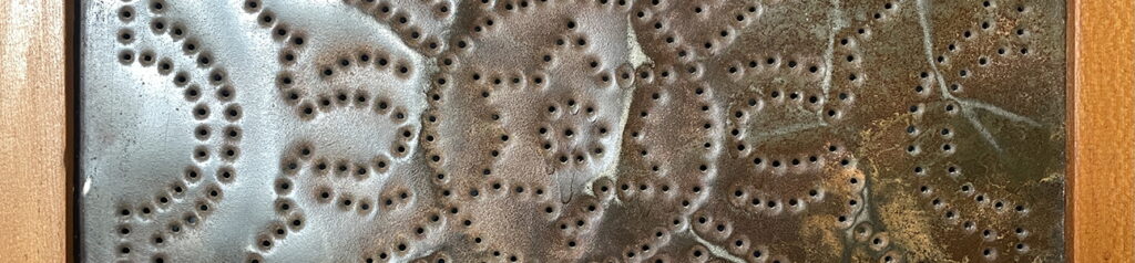The six identical tin motifs featured on my pie safe have a simple decorative design with floral motifs radiating from a central hex-star framed by a geometrical border. This is a signature element found on 18th and 19th-century Dutch Pennsylvania cabinets and symbolized protection. Tin panels could be painted or left without any further decorative additions. Tin panels could also be found on either side of the cabinet. Pie safes also featured one or two shallow top drawers.