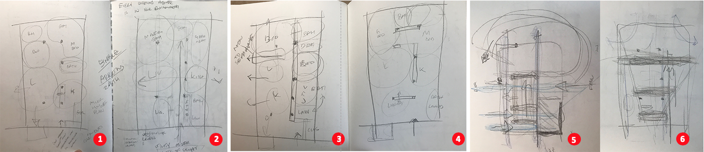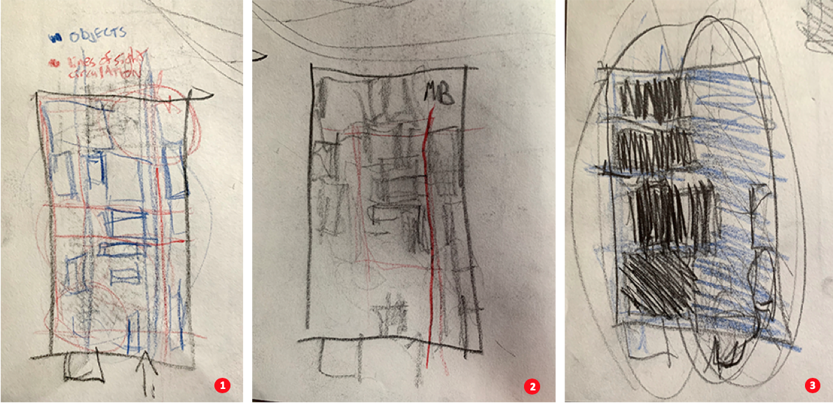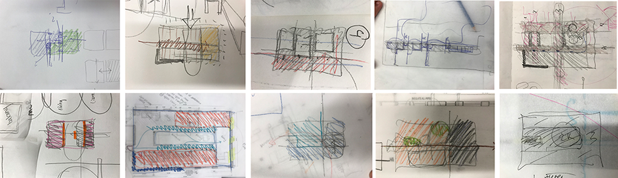 Contrary to the sketches in project 1, here, in project 2, the student’s energy and rapidity in thinking are expressed throughout each of the conceptual drawings. The boldness of the line and the primacy of the idea is accomplished through the usage of a thicker and darker lead with the introduction of color and occasional nomenclature for each space.