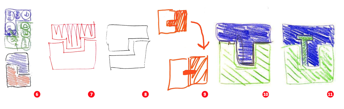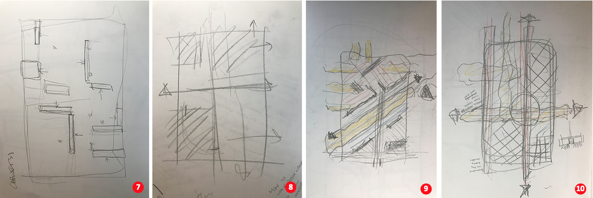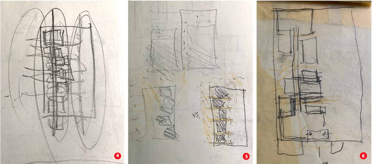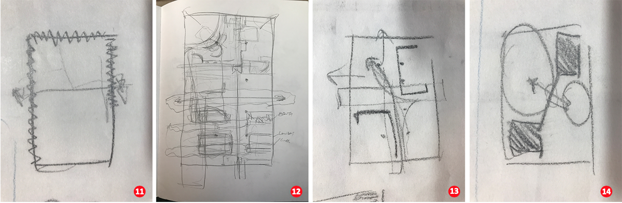 So what do these conceptual diagrams look like? And, if done repetitively over the course of the design, how do they evolve during the design process? To answer these questions, I am providing three student examples illustrating their final projects followed by a number of sketches that trace the genesis and refinement of their projects from initial thought to the final drafted plan. These rapid sketches can take multiple forms such as plan, section, axonometric, or in fact, any type of representation. In the following examples, they are expressed in plan. Critical to a successful conceptual diagram is that the drawings emphasize the abstract nature of the thought process, rather than a figurative expression of the idea.