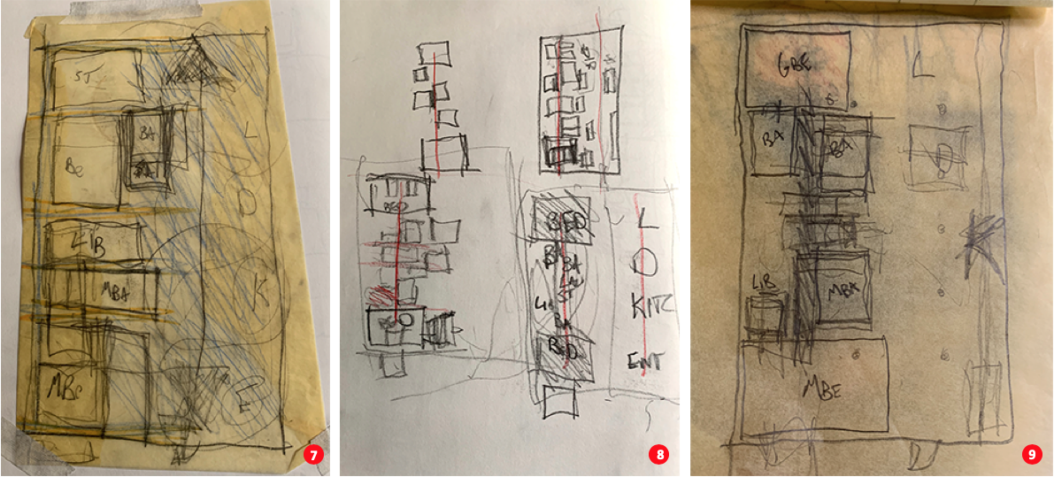 2. After several functional iterations and tectonic hesitations, the final position of the master and guest bedrooms are set in place at opposite ends of the loft (image 7). Both spaces are refined throughout the conceptual diagrams and expressed through thick cabinet walls that house a number of functions incorporating innovative bathroom layouts.