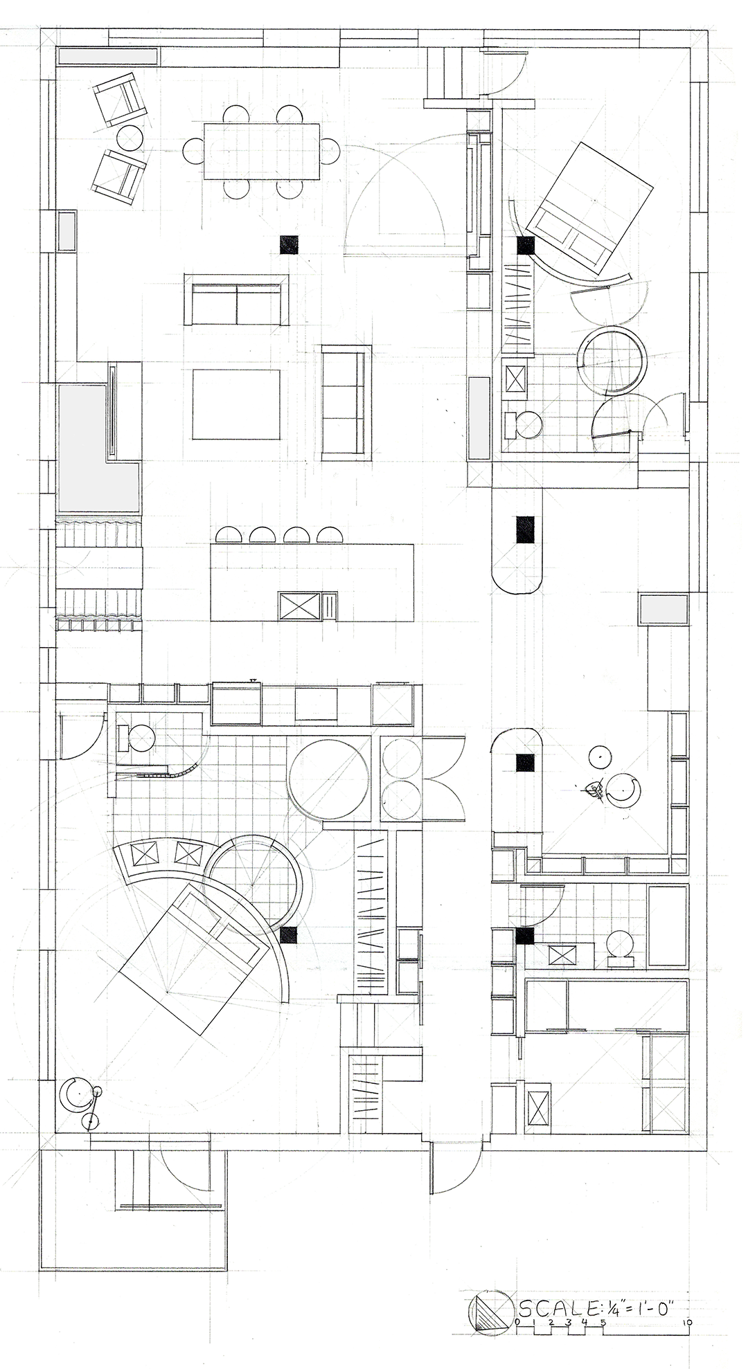 1. The idea of working with the existing columnar structure (images 3 and 10), which in the final plan (see above loft plan) is translated into a series of built-in cabinets that serve the entrance foyer and on the opposite end of the loft, become a multi-functional wall that defines the edge of the guest bedroom and the living room space, which also contains a clever and efficient Murphy Bed.