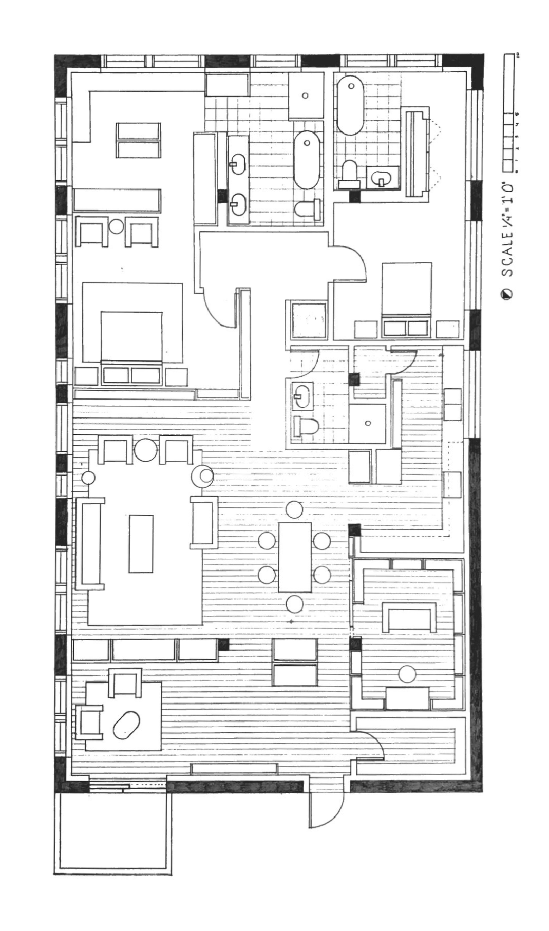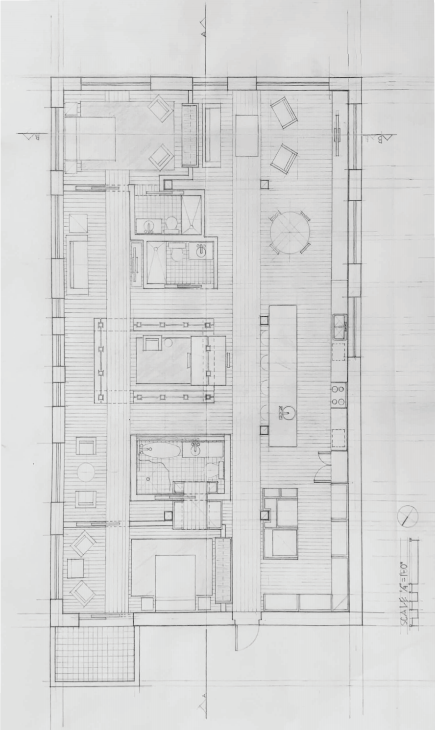 In these sketches, the student favored a delicate line weight to elucidate the prompt which was to renovate a loft. First, he worked through a series of bubble diagrams (images 1-4), and next, through ideas about possible spatial relationships between assigned and interpreted functions (images 5-8). Two important features emerged as constants in most of the conceptual sketches.