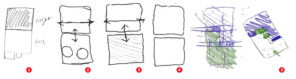 The final set of conceptual sketches for project 3 show a great sense of restraint in their overall expression. Through the use of basic platonic forms, the student’s search for a simple yet complex spatial organization is accompanied by elegant diagrams. While minimalist in their appearance, they convey the strength of the author’s intent to demarcate day and night and research how a common zone can be articulated between the resulting closed and open spatial organization.