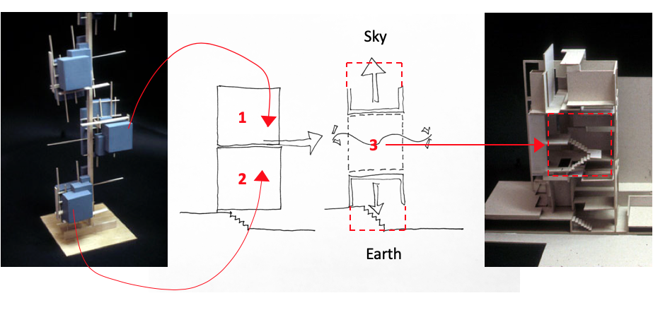 The student example in the above images one through four, show a strong dexterity in responding seamlessly between design and architecture. In fact, there is a strong reminder of the abstract vertical artifacts within the pavilions (above image 2 and 4 ), yet it is brought to a level of architecture that I, still today, find amazing.