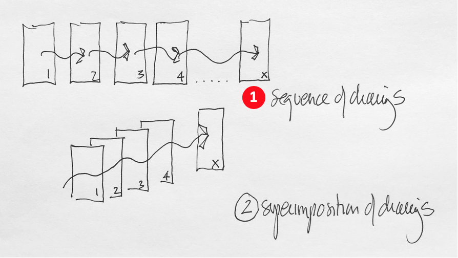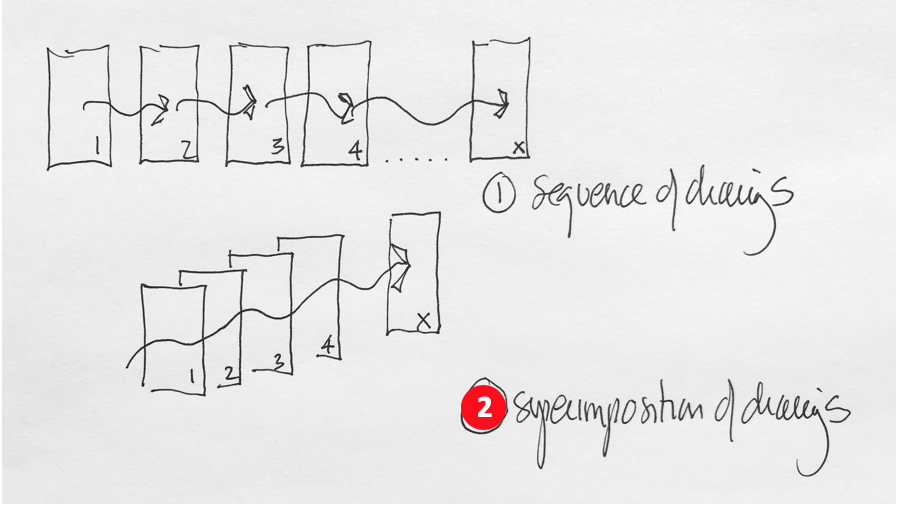 Working in the manner of a palimpsest, sketches are drawn over previous sketches -either directly over an original drawing or by using a transparent tracing paper to keep track of each new iteration, but always keeping in mind that each sketch is directly drawn over the previous one. The power of this second method is more about refining an idea rather than an exploration of multiple ideas, yet both are rarely in opposition and may be used simultaneously in the design process.