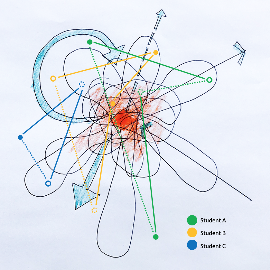 In this example (Image 2. Above), three students (A , B, and C) develop a personalized set of points of interest, connecting them in order to develop their ability and understanding of key fundamental components of the discipline of architecture. For example, student A may develop affinities with issues surrounding construction, materiality, detailing and skin facades; perhaps a portfolio of interest that could gain traction with a minor in construction management. Student B is interested in issues of equity, gender, race and urbanism, while student C focuses on issues of sustainability, landscape architecture and contextualism.