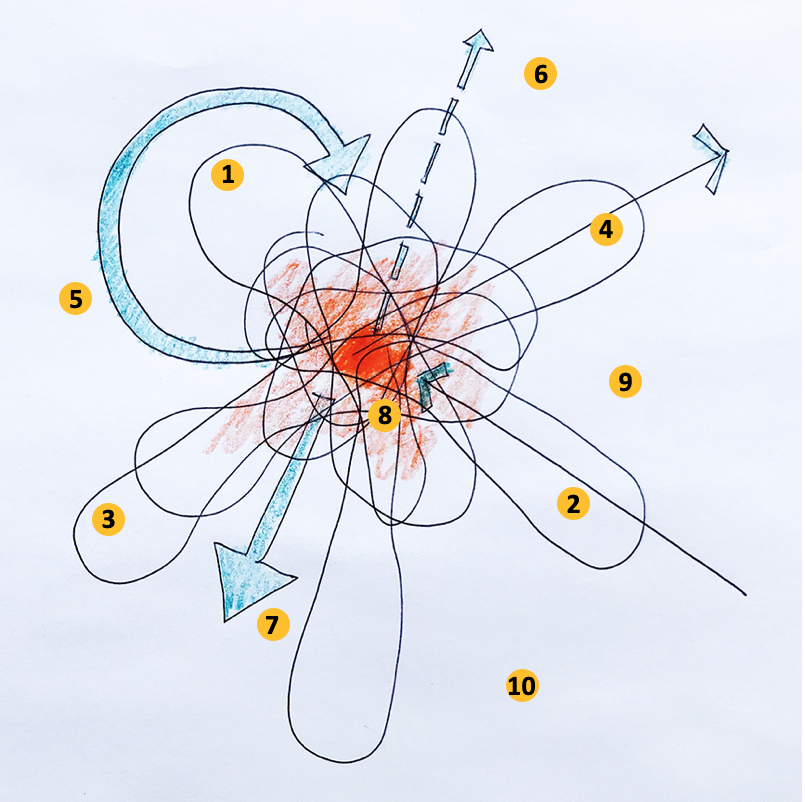 The above diagram (Image 1, above) describes an amorphous shape formed by multiple lines that depart from a center and extend in various directions with different lengths and intensities. These lines overlap each other and return to a focal point that might be called architecture (in orange), to re-emerge in various sizes.