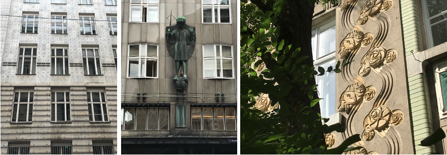 I remain mesmerized by the subtle choice of the marble that presents such a beautiful and delicate pattern, almost like a field of flowers. In fact, conjecturally, I see in Hollein’s meticulous choice of materials, a clin d’oeil to the delicacy of Gustav Klimt’s symbolic painting titled Tree Of Life or the facade of the Majolikahaus by Otto Wagner (Image 7 for right)