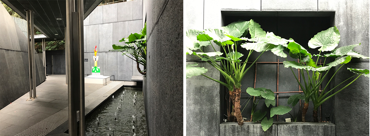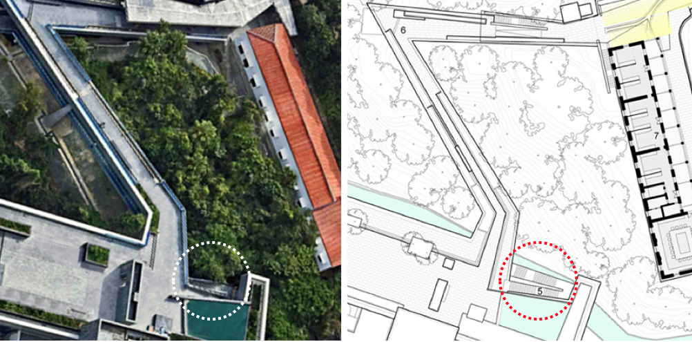 Linking the transformed three ‘landmark’ buildings—administrative offices (3), exhibition space (4), and theater facility (5)—the architects devised a strategy to bridge the terrain with a new L shape double-decker footbridge (2) that extends into a covered walkway protecting the path towards the existing historic buildings (image 4 above). This open-air experience offers guests the sensation of levitating in the lush sub-tropical greenery, while enjoying views of the Hong Kong skyline and, at a distance, glimpsing the bustling harbor. During each of my visits to ASHK, I felt that it is a place for quiet contemplation, void of the constant noise pollution of the city, an oasis in the middle of the metropolis.