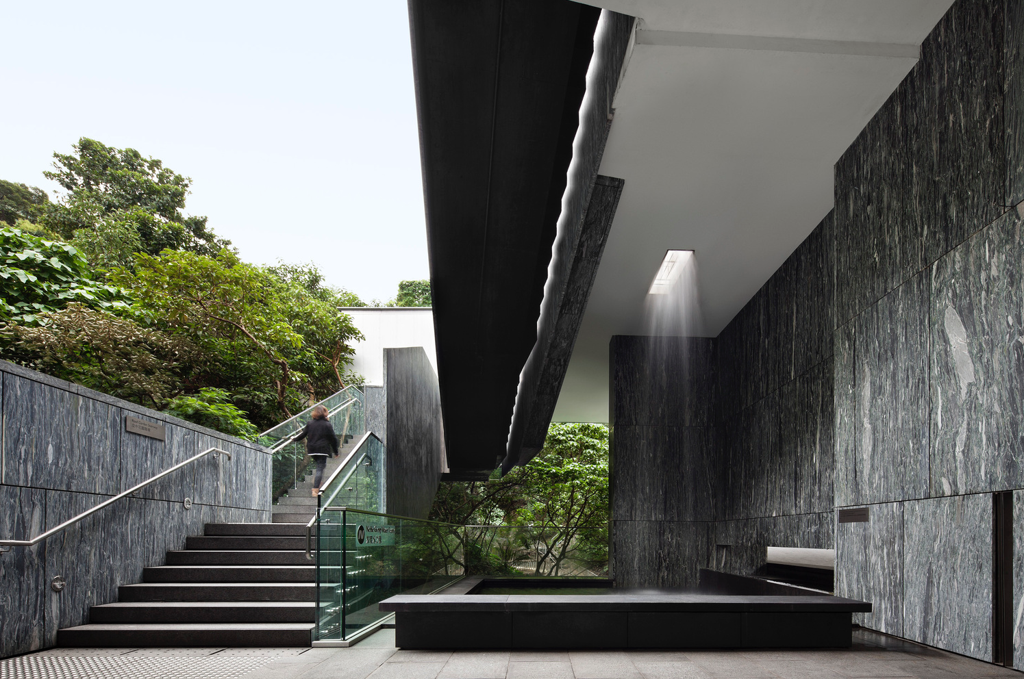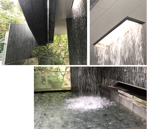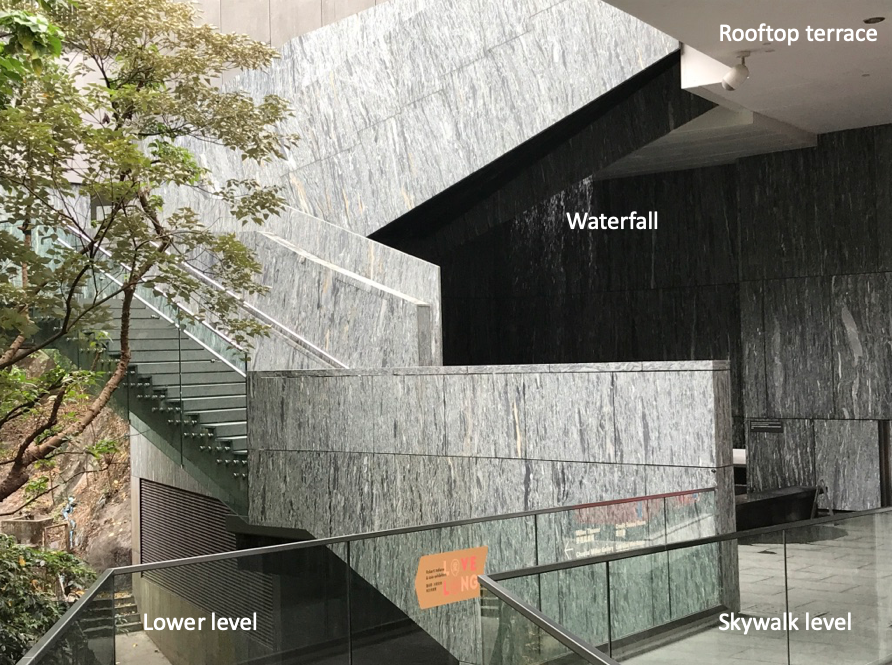 At the skywalk level adjacent to the staircase, is an open-air space mostly dedicated to a waterfall and fountain created by an opening in the floor of the rooftop terrace. The verticality of this reconstituted natural element visually accompanies the ascension of the staircase and sets in place a number of planes parallel to the stringers, including a retaining wall on Justice Drive (far back in image), the waterfall channeling light in an area that would have been otherwise dark, and the diagonal planes accompanying and defining the stair’s edges.