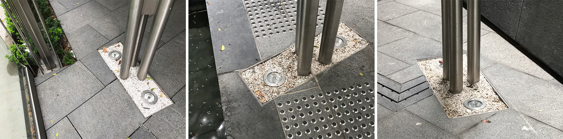 Carefully framed to negotiate the various geometries in play, the columns (image 6 above) do not show per se how they attach to the ground, yet its tectonics partake in a larger footprint incorporating a lined pea gravel rectangle with a system of lighting. The geometry of this “base” references the direction of the canopy while creating, and even distancing itself from the complex visual pattern of the pavement treatment.