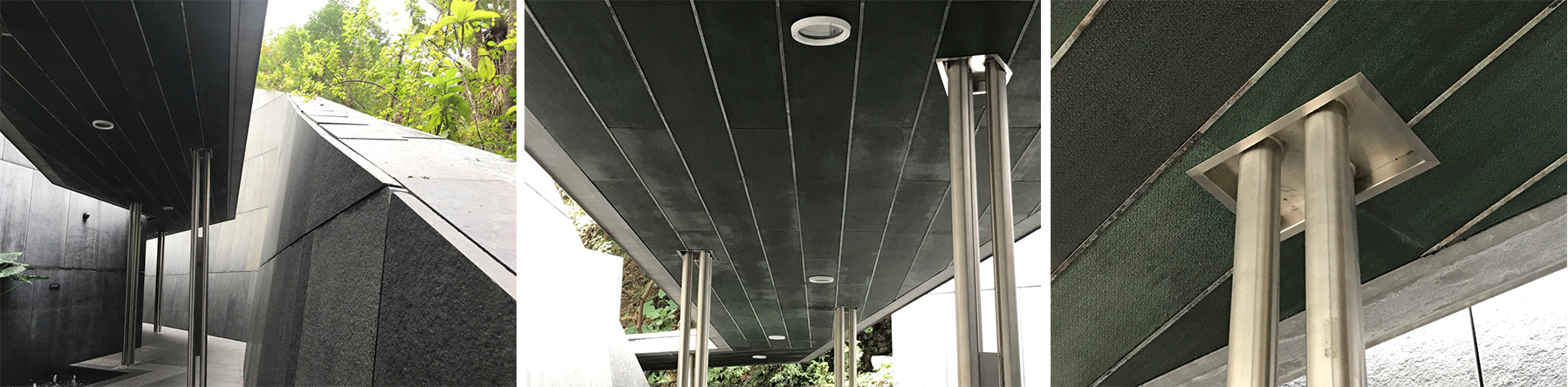 Related to the treatment of the base of the columns, the top of the three posts (Image 7 above) terminates in the canopy with a reversed stainless-steel pan suggesting the volume of a traditional capital; yet this time expressed in its absence rather than as an actual capital as part of the canons of architecture.