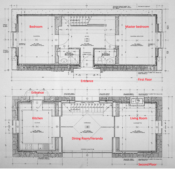 (Above image 12) Yet, incorporating the exterior space between both houses and giving them interiority makes the building contemporary, while remaining part of the building tradition of the village. The plans show the simple geometrical definition of two rustici with a first floor featuring bedrooms, and a kitchen and living room on the second floor.