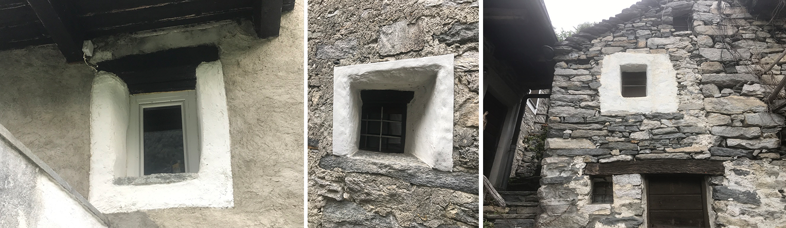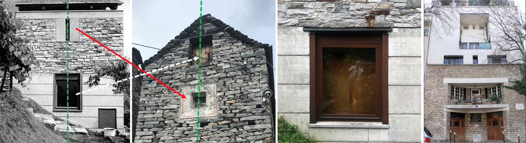 The western façade (left photograph in image 5) features one window opening at each floor level symmetrically organized around a vertical central axis. Having visited Corippo, which is a few miles north, I remember the densely packed houses and, in particular, certain window openings and their composition within the façade (middle photograph in image 5). Of course, my comments are interpretative, but I could not avoid comparing Vacchini’s façade to one that I noticed in Corripo. Two superposed openings are featured in both: a larger one above a smaller one (Corippo) and a smaller one above a larger one (Vacchini).