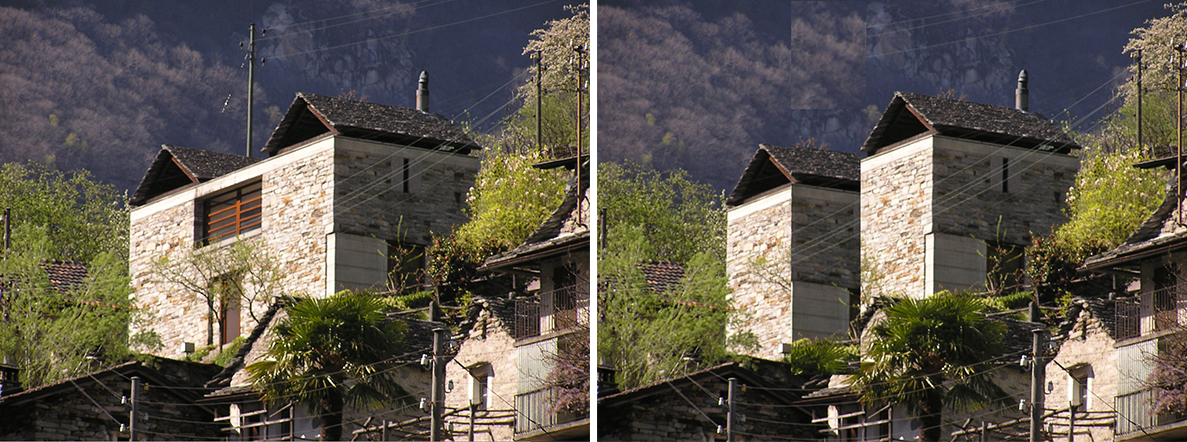(above image 11) If there is a punchline to this blog, I believe that it is in the return full circle to the identity of the building culture within the village of Vogorno and particular through the scale of this intervention. There is a magnificent move to work within the traditional building type of a single volume by combining two adjacent rustici. While the left-hand photograph shows the completed building as executed, the manipulated right-hand image created by me, suggests how two independent houses might have been designed and presented in the traditional manner of setting themselves within the landscape.