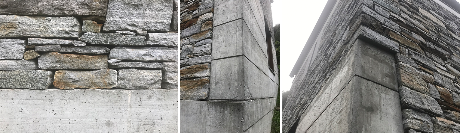 Noteworthy, is also the attention given to the horizontal striation within the concrete base, which with its shadowed texture, echoes the horizontal layering of the dry stones on the second floor, where the visible edges of the stone are the result of the lack of mortar.