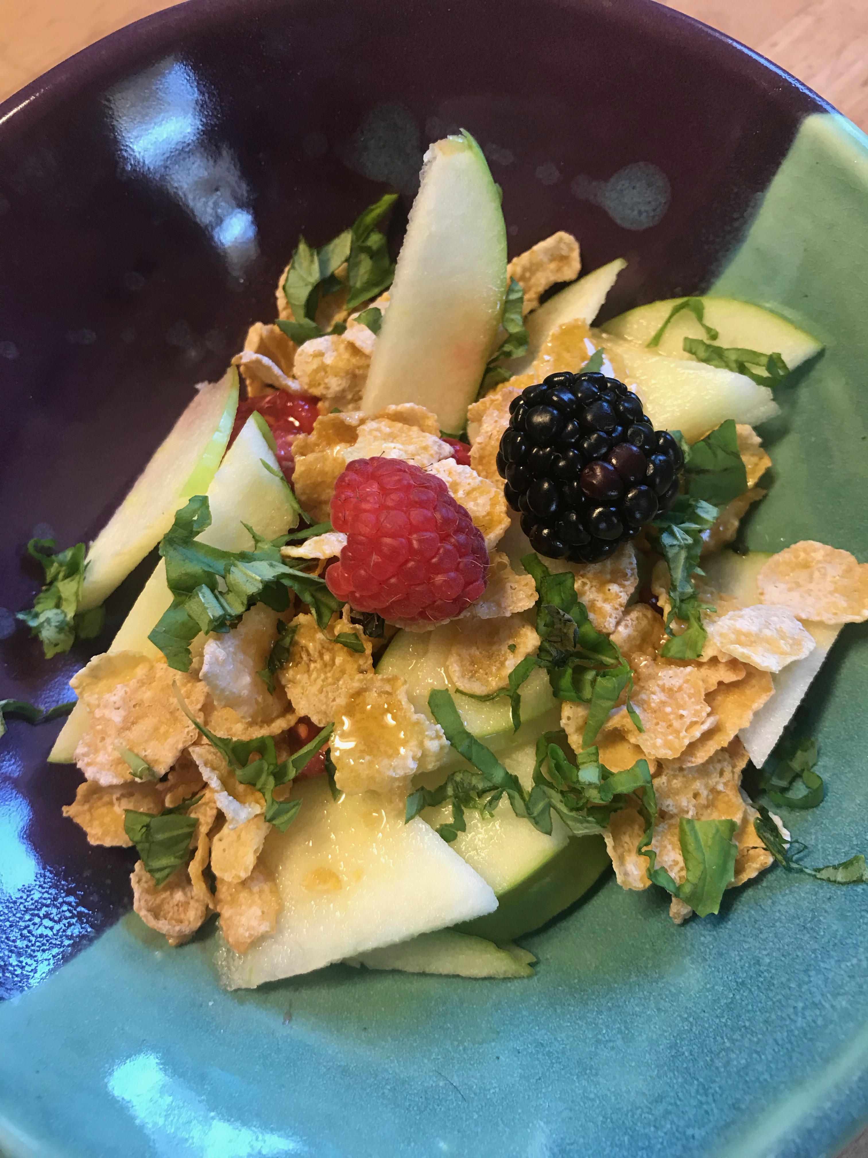 Banana and pear offers a rich and slightly sweet texture, while a few apple slices add tartness to the dish. And, depending on the season, you may wish to substitute one or two of those ingredients with grapefruit, fresh strawberries, or kiwis. The color combination, textures, size and thickness of each fruit will complement each other and become a symphony of flavors and colors.