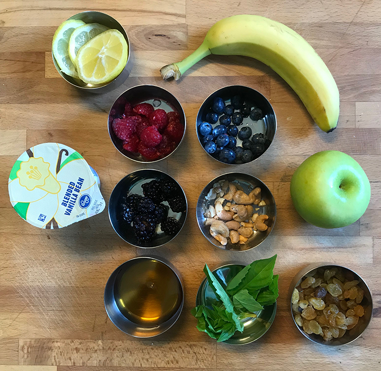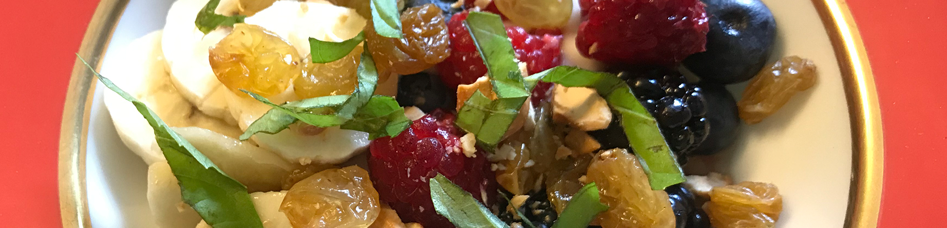 A well-chosen bowl or plate (consider size, shape and color) elevates the enjoyment of yogurt from a simple plastic container to a visual experience. Typically, I set half a small yogurt container in the bottom of the plate or bowl, then add a mixture of berries -blueberries, blackberries and raspberries (at times mashed to act as a sort of jam), half a sliced banana, and often thin slices of a Granny Smith apple or a ripe pear.