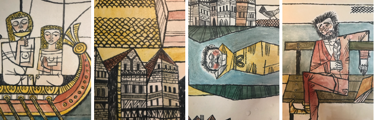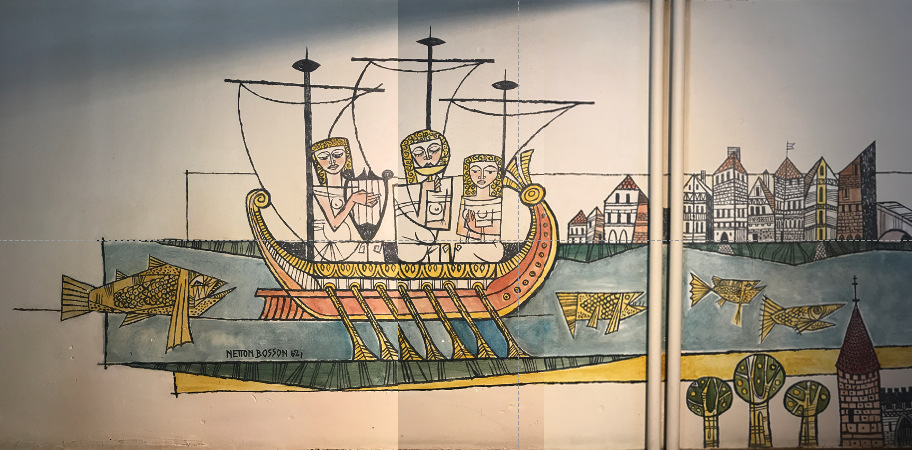 Similar to the famous Bayeux Tapestry, each segment of Bosson’s fresco is a visual narrative that translated Villon’s fable into allegorical pleasantness. Bosson’s gift was to give force to the narrative by providing iconographical content while being decorative.