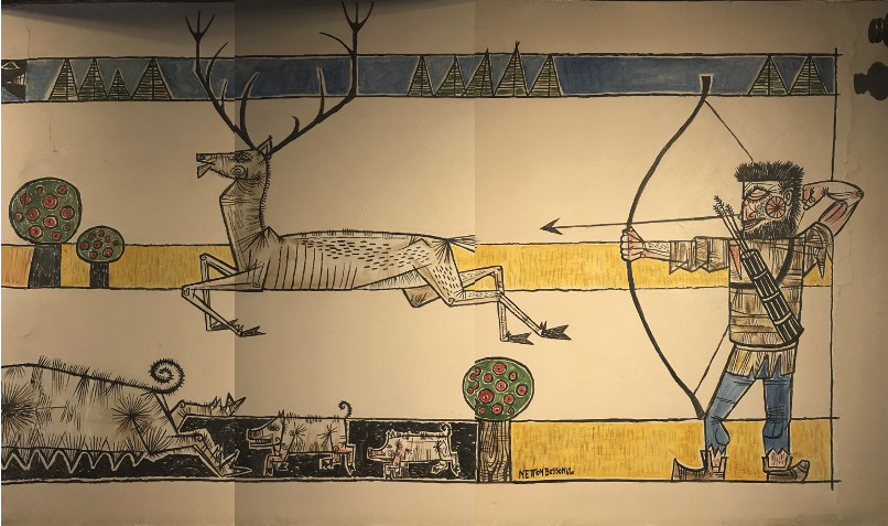 The frescoes that adorned the dining room were completed in 1962 and created by Fribourgeois artist, painter, and writer Netton E. Bosson (1927-1991). At the time of the making of the frescoes, Bosson was already an accomplished regional artist whose illustrative style was both realistic-abstract and deeply folk art inspired. In the context of a more rural environment where the frescoes are located—the school and nearby medieval castle of Gruyères are in the middle of a dramatic yet pastoral landscape—Bosson espoused in his art a more vernacular approach reminiscent of woodcuts or stylized stained-glass aesthetics.