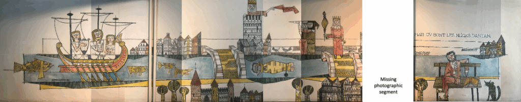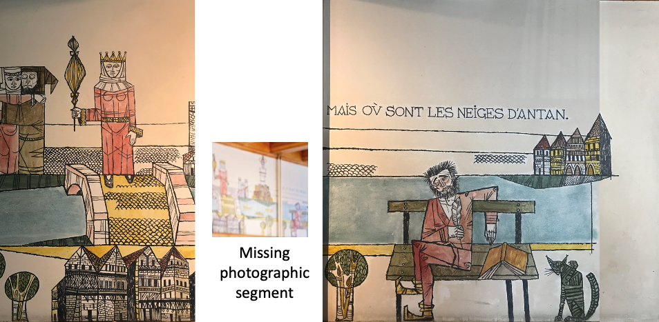 While collaging the panoramic view presented in image 3, I noticed at the far right of the scene, the famous interrogative refrain by Medieval French poet Francois Villon: Mais où sont les neiges d’antan? (Where are the snows of yesteryear?)With this knowledge at hand, I was able to retrace conjecturally—with the assistance of Villon’s ballad (see below)—the various themes developed in Bosson’s fresco that visually represent the Ballade des dames du temps jadis (Ballade of Ladies of Time Gone By), where Villon celebrates famous women in history with emphasis on those drawn from mythology.