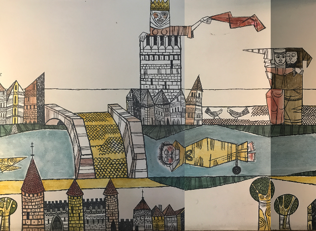 De chaque côté du fleuve s’étend un paysage urbain compact composé d’étroites façades médiévales à colombages, percées de petites fenêtres qui dessinent l’horizon menant à un pont (Image 6). Plus près de nous, de l’autre côté du fleuve, se dresse un château médiéval doté de tourelles et de toits coniques abrupts. Trois arbres majestueux, de la même taille que le château, suggèrent un paysage extérieur contrastant avec l’environnement bâti environnant.