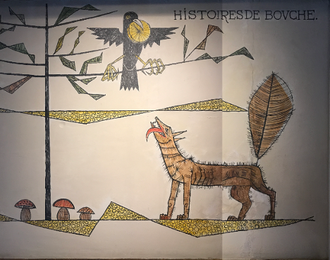 The image shows two characters: a crow in the tree and a fox gazing up to the bird salivating over the large cheese wheel. As the fable goes, after being flattered by the fox, the proud crow opens its beak to sing, thus dropping the cheese, which the fox immediately seizes. Here again, Bosson’s mural beautifully depicts the visual connection with the classic narrative.