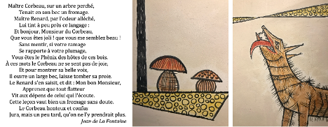 L’image représente deux personnages : un corbeau dans un arbre et un renard regardant l’oiseau baver sur la grande meule de fromage. Selon la fable, après avoir été flatté par le renard, le fier corbeau ouvre son bec pour chanter, laissant tomber le fromage, que le renard s’empare aussitôt. Ici encore, la fresque de Bosson illustre magnifiquement le lien visuel avec le récit classique.