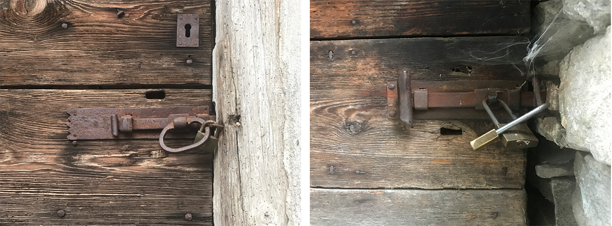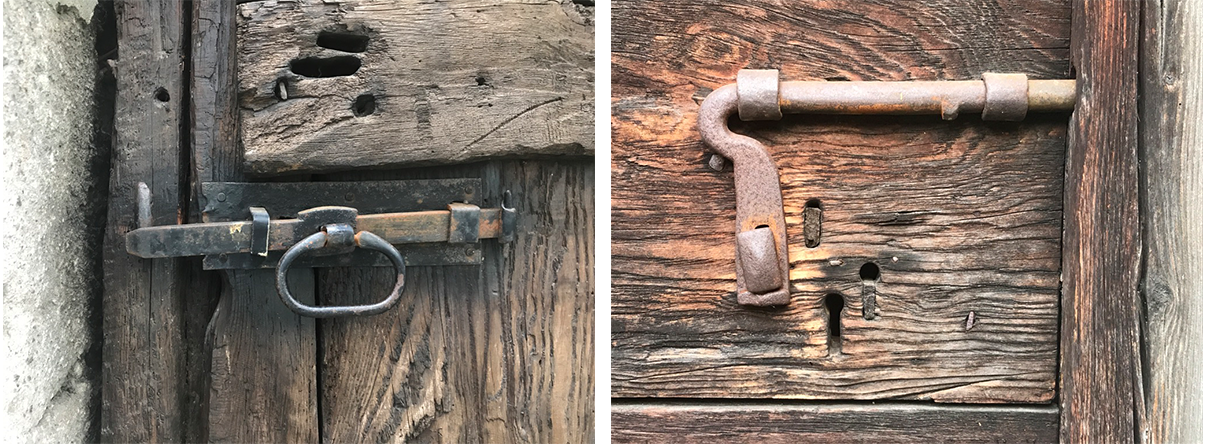As familiarity with Corippo settled in, I became intrigued by various openings and, in particular, the entrance doors of each dwelling. Deeply recessed in the wall, and small in scale, they were the only tangible indication of human habitation in the village. Each of the doors had a latch. Upon closer examination, most of the hardware was similar, incorporating a handmade design featuring a simple forged slide bolt and a door latch mechanism.